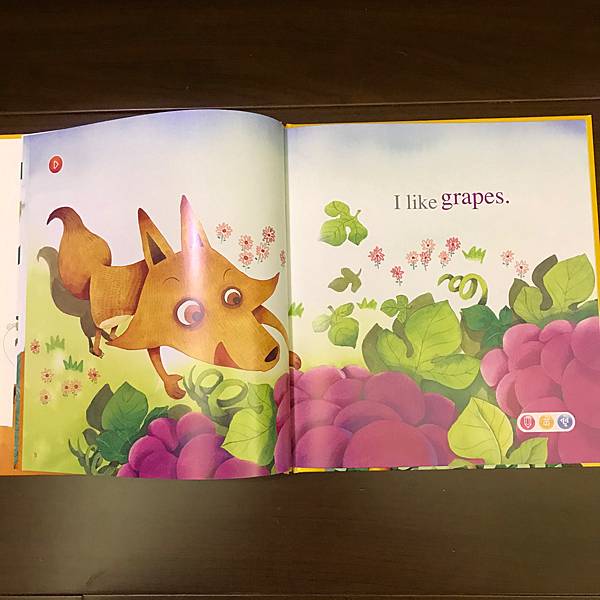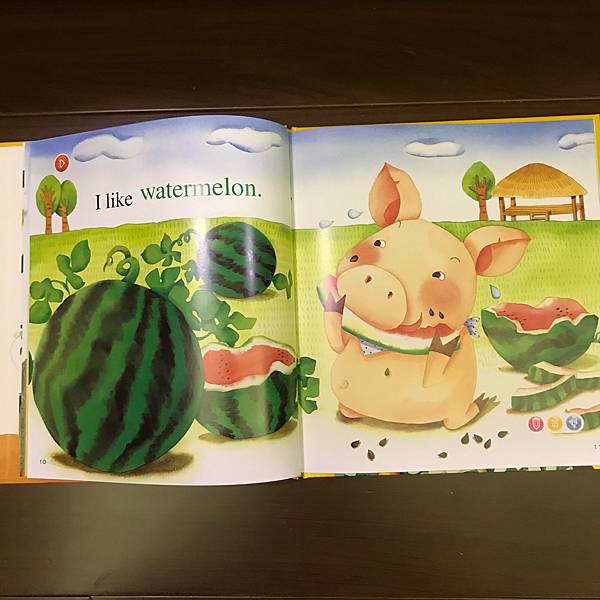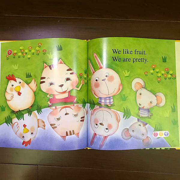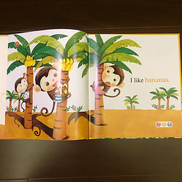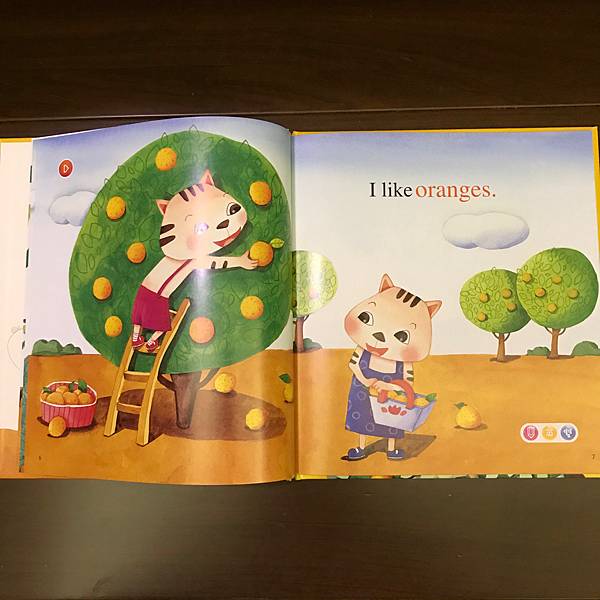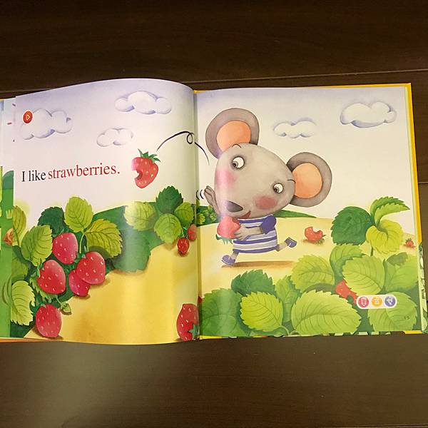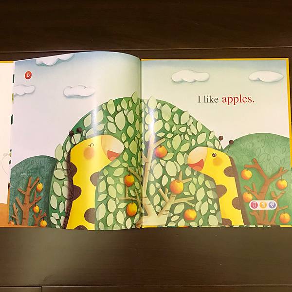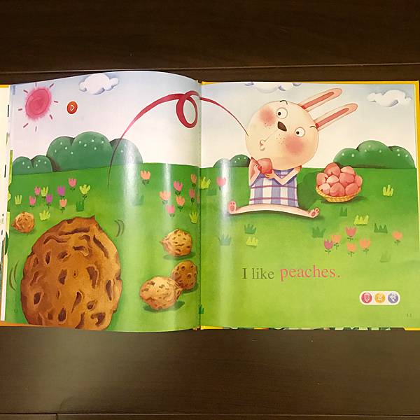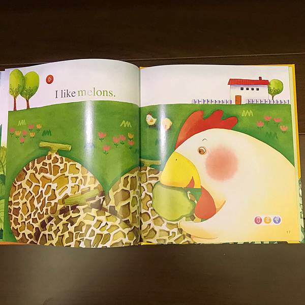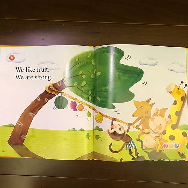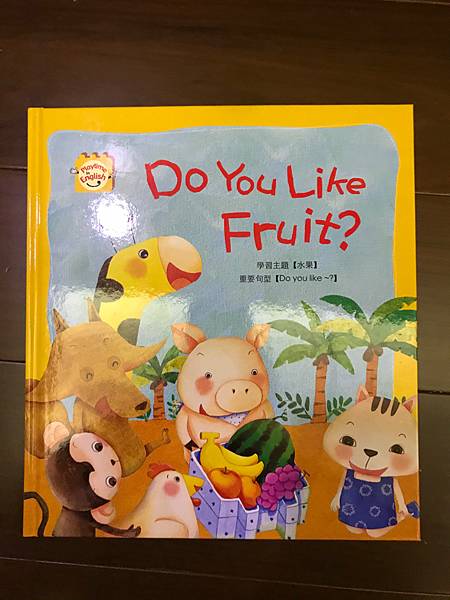 書裡利用了動物吃水果,單字做了顏色區分,讓孩子也可認識水果的顏色,也告知孩子多吃水果的好處。